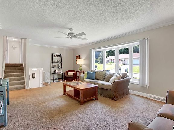 Like to Entertain? Updated kitchen w/soft close cabinets, quartz countertops & tile backsplash opens to dining room that has access to spacious Living Room w/large Bow Window & windowed sunroom. Need more entertainment space? Finished lower level w/wet bar, mini fridge & gas fireplace opens to exterior patio & beautiful mountain views! All bedrooms have ceiling fans. Home boasts many updates and has been freshly painted inside and out! Full attic storage, 1 car garage, central air & more! A joy to show!