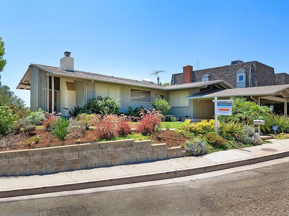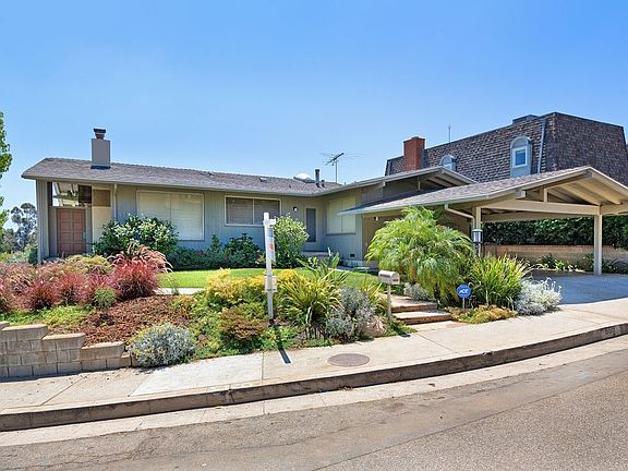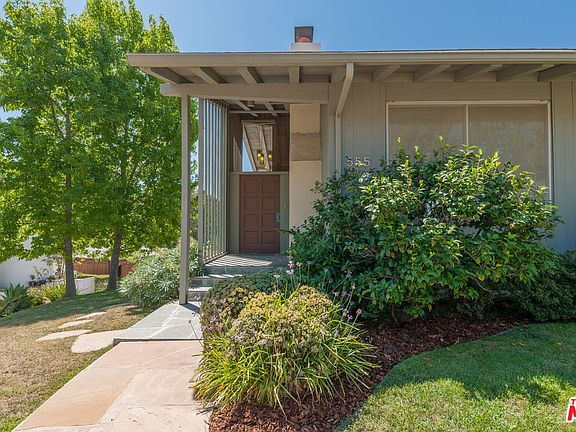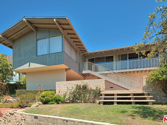 Kenter Canyon, mid-century architectural by noted architect, Paul Sterling Hoag, features sweeping canyon views, over 2300sf, 5 beds, 4 baths, grassy yard, and private elevated lot on a quiet street off Bonhill. Opportunity to remodel this architectural gem that has never before been on the market for sale. Main floor features open living, family and dining room areas with walls of glass with beautiful canyon views, vaulted wood beam ceilings, and fireplace. Viewing balcony off the dining room and living rooms with stairs to rear yard. Master bedroom suite, three additional bedrooms and two bathrooms on the main floor. Downstairs features a bedroom with bath and separate entrance and access to patio and rear yard. Two car covered carport + detached garage.