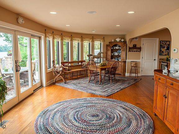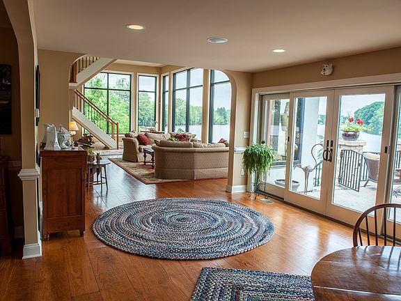 R-10293 Waterfront oasis with unparalleled quality and craftsmanship that is one-of-a-kind. This stunning home features hand-finished wood flooring, custom cabinetry, granite counter/bar tops, and a glass rear wall providing unobstructed, unique views of Silver Lake. Main level master suite offers a gas fireplace, tiled shower, soaking tub, and spacious walk-in closet/changing room. The media room boasts theater seating and a true "at the movies" experience. Lower level contains two additional bedrooms, a full bath, and a large open FR with gas fireplace and ample storage. This area also features a wine cellar and tasting room, great entertaining. Another very special feature of the home is the observation room on the second floor which will take your breath away every time! This space provides a 360-degree view of the surrounding area and the best view of the lake that can be found. The beautiful outdoor space includes a massive elevated patio covered with stacked stone, allowing for endless entertaining possibilities, both day and night. The terraced yard leads down to the lakefront, which has a stone bulkhead and private dock. Waterfront luxury at its best!