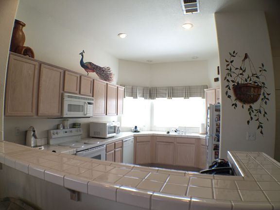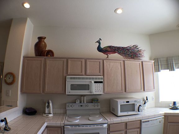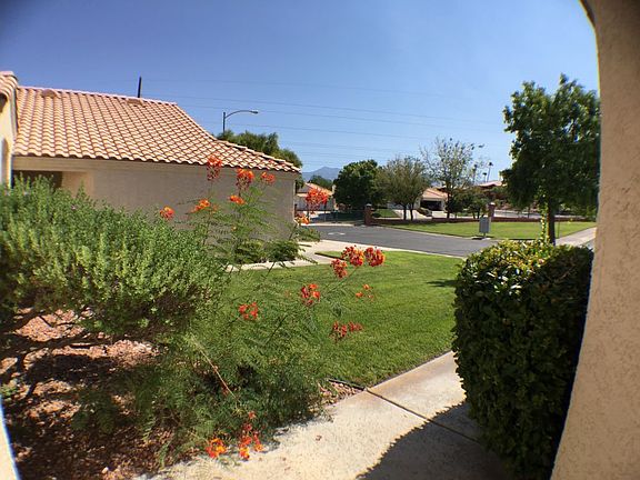 This townhouse in gated Crystal Canyons makes a perfect love nest retirement home, or an ideal second home. Well maintained 2 bedrooms, 2 bathrooms, 2-car garage with a new custom tiled walk-in shower for your ease of use in master bathroom. Convenient glass doors leading out from your master bedroom to the covered patio. Vaulted ceilings add to the feeling of spaciousness throughout the great room and master bedroom areas. You'll appreciate the ceaseless beauty of the elegantly hand painted treasures of greenery, a peacock and pots as you enter into the kitchen area. Crystal Canyons offers its own association swimming pool only steps away from your door, in addition to membership to the Mesquite Vistas association pool and clubhouse facilities that include tennis court, bocce ball, exercise room and snack bar. Call now...you'll be glad you did.