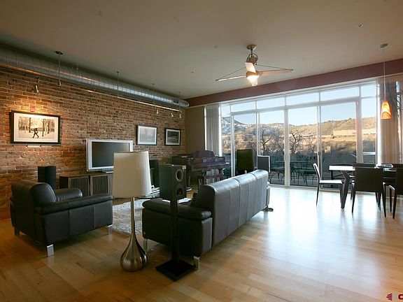Luxury Loft Living On The Animas River. Convenience abounds in this unit - not only with it's location near all Durango has to offer - but also within the complex itself with two deeded parking spaces and a deeded storage unit right out the front door. The main level of the loft features hardwood flooring, custom lighting, a brick accent wall, and sliding glass door access to a patio overlooking the Animas River. The kitchen is spacious with stainless steel appliances, granite countertops, maple cabinets and breakfast bar seating. The bedrooms are located on the upper level - both featuring private balconies with River views. The master bath is very spacious with a deep soaking tub, a walk in shower and a dual vanity. Another full bath and the utility room round out the upper level.