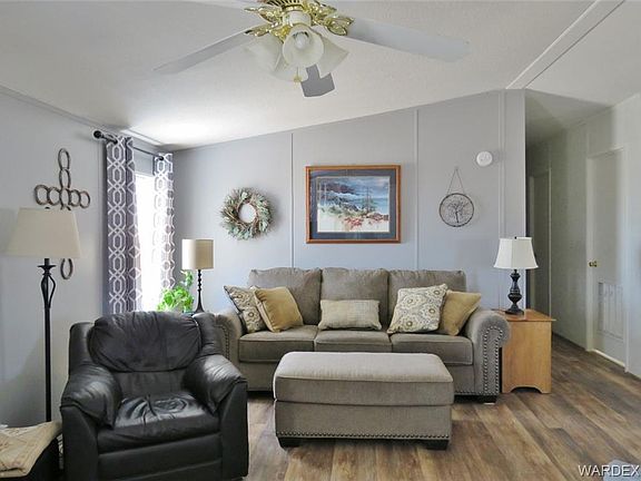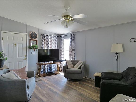 This 3 bedroom 2 bathroom ground set manufactured home is as cute as they come. The home has a large living room that's open to the dining area. Kitchen has a stainless microwave, dishwasher and refrigerator all less than two years old. Big corner pantry, corner sink with windows above and gas range. Master has a walk in closet, dual sinks, large soaking tub and walk in shower. Vaulted ceilings, ceiling fans, vinyl planking flooring, central heat and air and inside laundry room. Home sits on one fully fenced acre parcel with a font coved patio and side covered patio with a private fenced yard. Two car carport, storage shed, great views and horses are ok too. Water is provided by Valley Pioneer Water Co, propane tank is leased from AmeriGas and roads are paved from Highway 68 right to the house. 555 S. Santa Maria Rd. Golden Valley, AZ. Highway 68 coming from Kingman, left on paved Verde, right on paved Shipp, Left on paved Santa Maria, 4th house down on left.