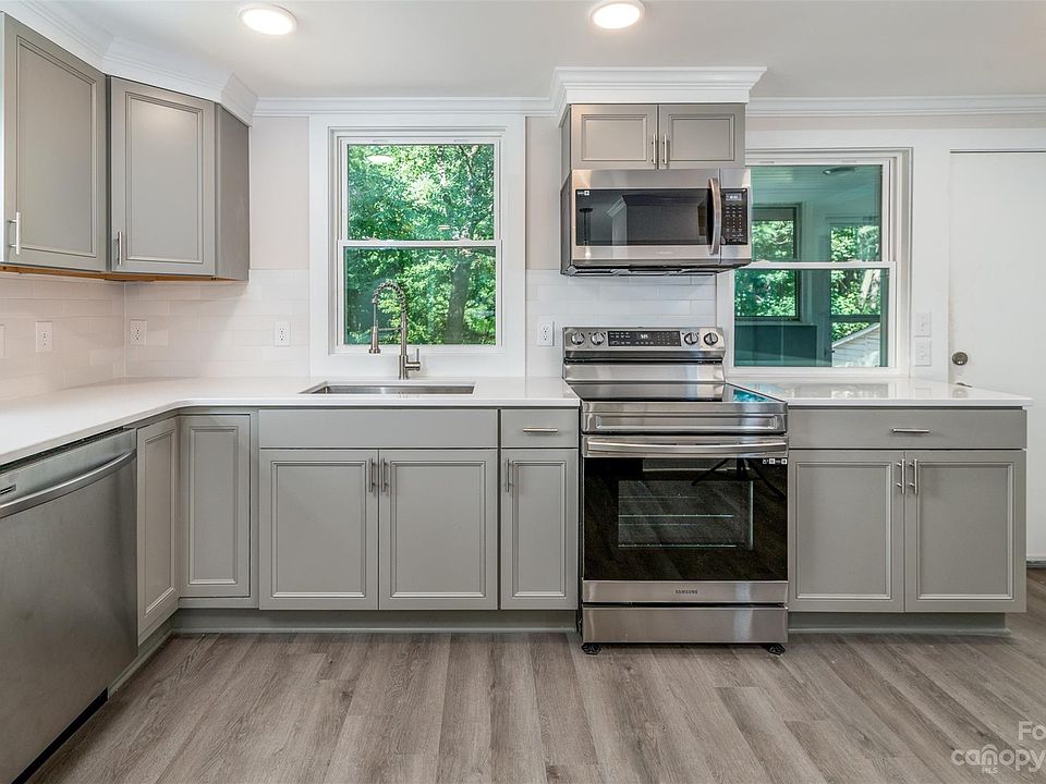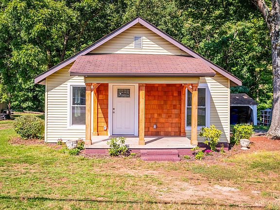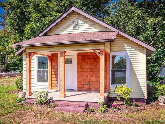 Incredible remodeled bungalow on the southern edge of downtown Mooresville. This stunning residence has undergone extensive renovations to embrace a modern open floor plan. The spacious contemporary kitchen boasts quartzite counters, SS appliances, and convenient breakfast bar. It flows seamlessly into the dining area and large, well-lit living room, creating a welcoming and airy atmosphere. The tiled bathroom has been beautifully redesigned and features a freestanding tub. Nearly everything in this home is brand new, including flooring, windows, appliances, fixtures, lighting, HVAC, water heater, ceiling fans, fresh paint, and more! Step outside onto the cvd. front porch, perfect for unwinding, and explore the vast backyard with endless possibilities. There's even a detached 1-car garage/carport with extra storage space for added convenience. The property sits on a generous lot right on the edge of town, providing a rare combination of quality and affordability that's hard to come by.