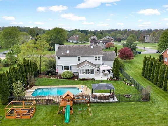 Tucked away in North Valparaiso and situated on a full acre, resides this amazing well maintained 4+ bedroom, 3+ baths, 3 car garage 2-Story home! The eat-in kitchen with new granite counters and stainless appliances opens to the great room with a stone fireplace. Additionally off the kitchen is a 3-seasons room with stunning views of the property that includes patio, deck, gazebo, fire pit, fenced back yard and 16X32 in-ground pool equipped with diving board for summer enjoyment. The large master suite offers walk-in closet remolded bath with convenient double sink vanity. All 4 bedrooms are spacious and have great closet space. The basement features a family room, den(used as a bedroom) and ample storage space. Some of the updating includes new front door, kitchen back splash, furnace, a/c, painting, well pump, upper level Pella windows, new flooring through out and newer pool liner. This home is truly move in ready and stellar for family enjoyment or pool side entertainment.
