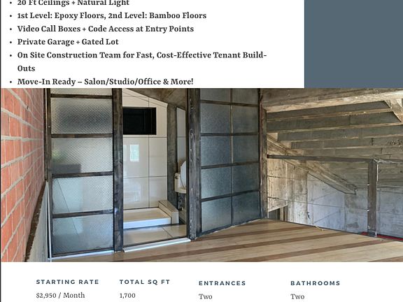 Starting Rate/Month - $2,950 Total Square Feet - 1,700 | Zoned Live/Work | Private Garage + Gated Lot Walk to the Mercedes Benz and Marta - Close by the Beltline Direct access to I-20, I-75 and I-85 - 15 Min to Airport Can be Leased w/ Suite A2 - for full floor occupancy HIGHLIGHTS Newly Renovated: Modern finishes and attention to detail Zoned Live/Work Commercial & Residential 30+ Smart Security Cameras + Fiber Optic WiFi Full, Open Kitchen + 2 Bathrooms High Ceilings + Skylight + Ample Lighting + Hardwood Floors Features Private Entrances w/ Digital Keypad Locks Video Call Boxes + Code Access at Entry Point Private Garage + Gated Lot On Site Construction Team for Fast, Cost-Effective Tenant Build-Outs Move-In Ready Salon/Studio/Office Build-Out