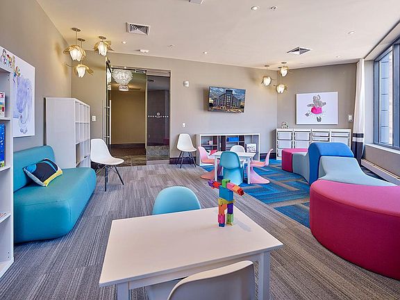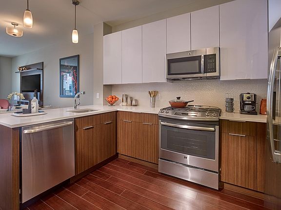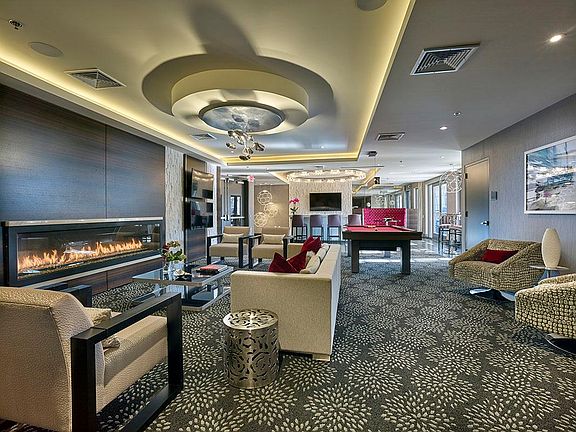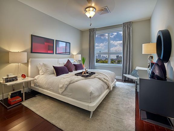 Interior view of courtyard, large terrace, 9 ft ceilings, sleek modern finishes, walk-in closets, ceiling fans. Fitness center, pool, roof top lounge, beautiful resident lounge. Pet friendly, 24hr concierge, and free pick/drop off drying cleaning service.