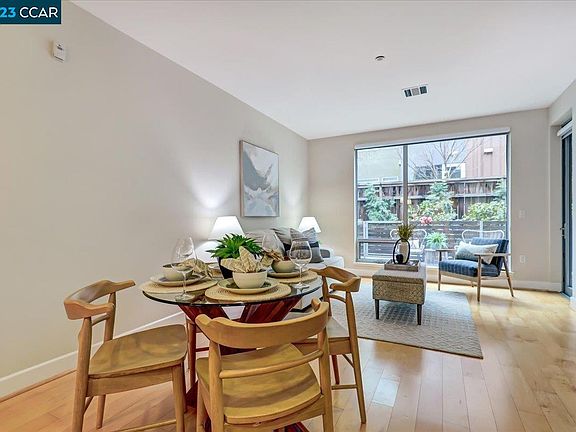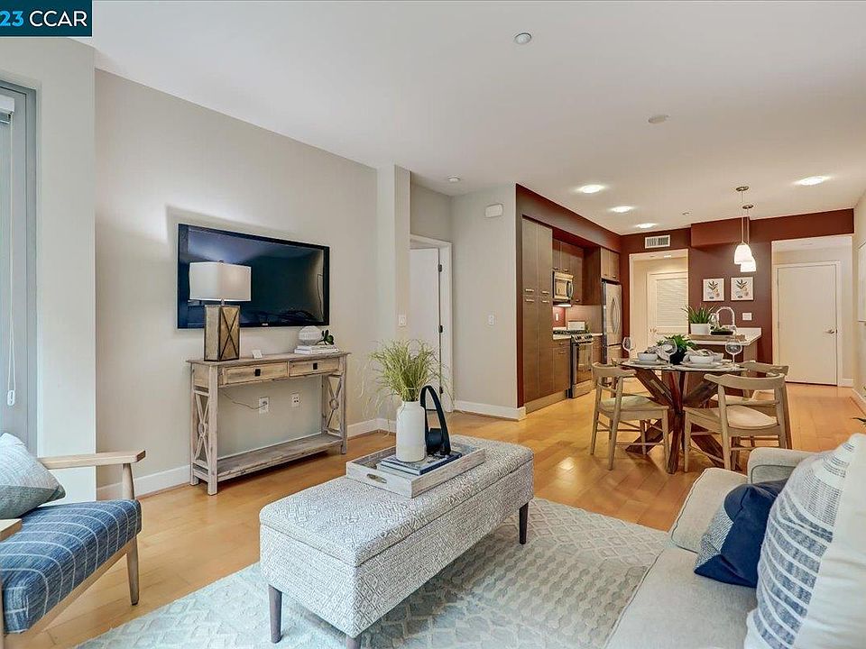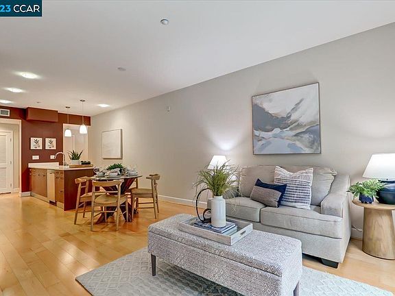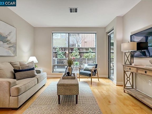 Contemporary ground floor condo within walking distance to BART station, Target, and vibrant downtown Walnut Creek. Inside this lovely home you'll find a spacious layout with a desirable open concept Living Room/Dining Area next to a modern Kitchen with an abundance of sleek cabinetry, stone counters and stainless steel appliances. Home chefs will appreciate the gas cooktop and built-in microwave. A large Primary Bedroom with sliding glass door to the patio, has a ton of storage space with both a sought-after walk-in closet and separate reach-in closet. The adjoining Primary Bath has contemporary cabinetry, stone counters, and dual sinks and the split bath layout separates the vanity area from the Toto toilet and shower over tub. A cozy room overlooking the manicured courtyard would make a great home office or second bedroom and a half bath off the hall is perfect for guests. Laundry is a breeze with a stacked washer/dryer in the unit. Enjoy outdoor entertaining on your large fenced patio. Parking is easy with two parking spaces in the secured underground garage. Fabulous building amenities include a stunning roof top deck with fireplace and kitchen, on-site Fitness Center, and Media Room for large gatherings.