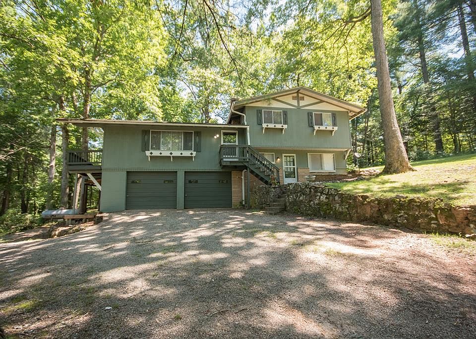 Just a few miles from town is the quiet wooded community of Swiss Colony, This home's setting has a very nice yard with a few shade trees, stone landscape wall along the driveway with stone walkway leading up the steps to the front door & living area. You can relax sitting on the front stone patio with a koi pond nearby or entertain on the large deck out back. Up those stone steps to the front door you are greeted with hardwood floors and a big brick fireplace with gas logs in the living area with vaulted ceilings & wood beams. The dining area & kitchen are open with a breakfast bar & counter dividing the rooms. Sliding glass doors from the dining area lead to that large deck overlooking that great backyard. Back inside the house and a few steps up lead to the 3 bedrooms and full bathroom. Up here you will want to check out all the great storage in the hallway. Down a few steps from the living area is another full bathroom and two bonus rooms, which could be used as bedrooms, a family room, office, workout room... This house also has a 2 car garage with laundry hook up in the garage. We had 2 Bars of LTE cell service while at the house.
