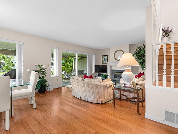 Gated MASTER ON MAIN living in this beautifully maintained home. The spacious, level-entry layout features a generous primary suite with a renovated ensuite and full laundry just steps away. Well-kept kitchen w/ stainless steel appliances, breakfast nook & living room w/ formal dining room. Enjoy a private backyard with a large covered concrete patio—ideal for year-round relaxation or entertaining. Freshly painted and equipped with air conditioning for all-season comfort. Upstairs offers a versatile retreat with an oversized second bedroom (perfect for guests, TV, or hobby room), full bath, and a handy office nook. A large double garage + four nearby visitor spots make parking effortless. The clubhouse & pond are a 4 min walk away. The ideal downsizer—spacious, bright, and move-in ready!