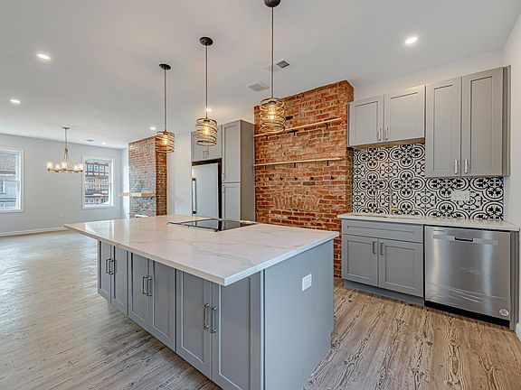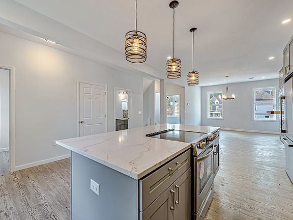 This beautifully renovated home features modern vinyl plank flooring throughout, a spacious living room with a decorative fireplace, built-in shelves, and large windows for natural light. The updated kitchen includes a central island, quartz countertops, upscale cabinetry, and stainless-steel appliances including a French door refrigerator, gas stove, microwave, dishwasher, and garbage disposal. The second floor offers a half bath and a laundry room with washer and dryer. The third floor includes a master suite with a private bath and walk-in closet, as well as another bedroom with an attached bath. All bedrooms are bright, roomy, and equipped with remote-operated ceiling fans. Additional features include a large front porch and a spacious unfinished basement for storage.