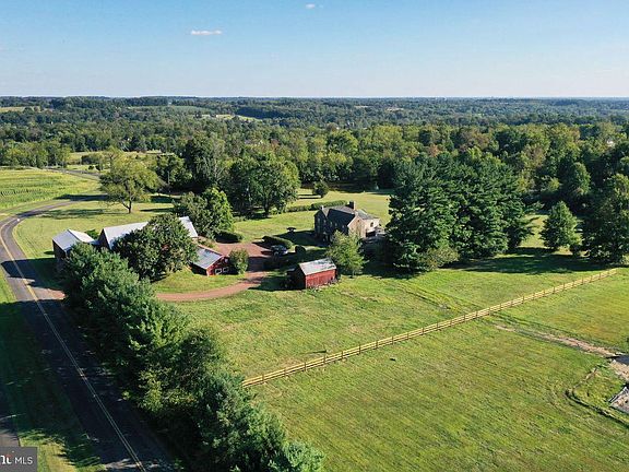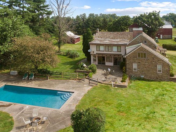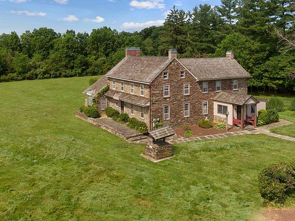 This quintessential 1830s Bucks County stone farmhouse on 8.03 acres with coveted barn, indoor RV parking, corn-crib, pond, and in-ground swimming pool boasts 4 bedrooms, 4 bathrooms, with tasteful updates throughout. The relative openness of the first floor - an anomaly in old farmhouses – allows for the living and entertaining spaces to flow easily, while still managing to maintain the wonderful level of warmth and coziness that you would expect from a traditional stone farmhouse. The kitchen is large and inviting with a huge stone fireplace, warm woods, and plenty of light that shines through the wall of windows in the large den, dining, and living room. It is bookended with a spacious laundry room/mud room combination, amply sized powder room, and butler’s pantry. There is a great and private flexible space at the bottom of the main staircase that could be used as an office, gym, or additional space for when, undoubtably, guests come to visit you. The primary suite is an unbelievable treat in this antique home: spacious, tons of natural light, large walk-in closet, and a spa-like bathroom with double vanity, soaking tub, and walk-in shower. The three additional bedrooms are charming with wonderful views and share two additional hall bathrooms. The outdoor spaces here will make your home the favorite gathering place for your friends and family - whether it be to make use of the barn that offers endless possibilities for all your hobbies, cars, trucks, four wheelers, and toys, or to enjoy barbecues on the large back patio while enjoying the 12 foot deep, salt water, gunite pool and surrounding area that offers expansive and panoramic views of the Bucks County countryside. The home has truly remarkable utility enhancements (making it the unicorn when it comes to old farmhouses): it has its own solar panels that generate electricity to off-set traditional electric costs (so much so, that the owners rarely have an electric bill), it was converted to public sewer in June of 2024, and is also on natural gas. A few additional bonus features (as if there could be more!) to note: the barn also has a large separate parking bay that will allow for your oversized RV or car collection, and the sellers believe (and have documentation) that an accessory dwelling is approved for the property. All of this just minutes from downtown Doylestown, 25 minutes to New Hope, and easy access to 611 & 413; this property offers the perfect balance of tranquility, country living, and convenience.
