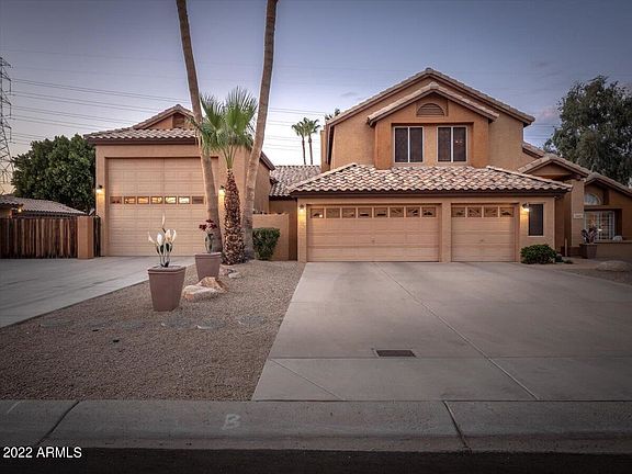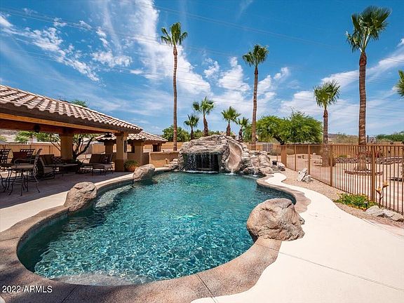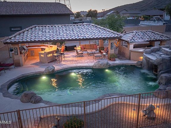 BRING ALL YOUR TOYS!!! Car collection, boats, ''Lake Pleasant is 30 mins away'', ATV's, trailers, RV's or setup an awesome shop in this Huge 70' garage, plus a separate 3 car garage, both with ample storage cabinets. This home is situated on a .80 acre lot and features a custom wrought iron & glass entry door, formal living and dining, updated kitchen with beautiful hardwood cabinetry, a granite peninsula counter and SS KitchenAid appliances. A beautiful double-sided stone-fireplace, an awesome family room complete with a pool table and 11' custom built bar that looks out to the resort backyard. *Truly an entertainer's delight! The 4 bedrooms include a Master suite with a private 400 sf balcony that overlooks the fabulous backyard. All 3-full baths have been updated!
