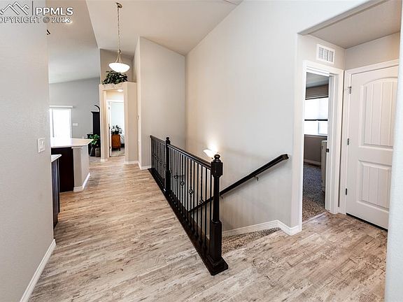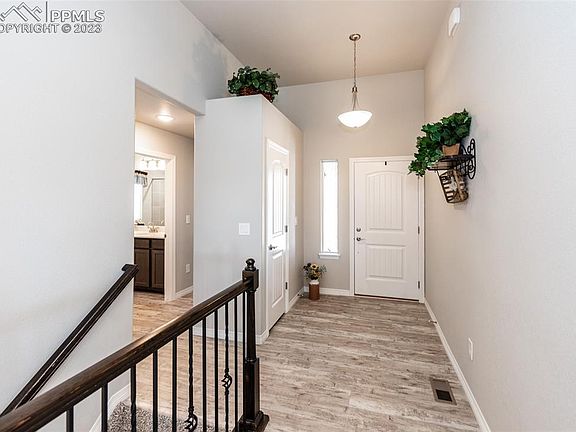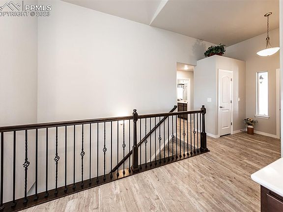 2.62% VA assumable loan payment $2600. This home has it all - low monthly mortgage payment, views, on a cul-de-sac, move - in ready conditon, under 2 years old. Views, Views, Views! This home sites back in the neighborhood with views of Pikes Peak, Front Range, and City of Colorado Springs. It backs to open space so views will never be obstructed. This lovely, well cared for Ranch style home has an open floorplan with fully finished walkout basement. Walk through your front door with 2 bedrooms and a full bath off to the right. Further down the hall, enter your beautiful kitchen with 42" upper cabinets, sparkling white quartz countertops, stainless steel appliances with a gas self cleaning range, and pantry. The large island has plenty of room to accommodate many and overlooks the great room. With vaulted ceilings and lots of windows, this room feels very bright and inviting. From the great room, walkout to your lighted covered deck with amazing, unobstructed views of the mountains. Back inside, you'll find the Master Suite tucked in the back of the house off the great room. Master bedroom is spacious with a luxurious 5 piece master bath with jetted soaking tub, double vanity, separate shower, private powder room, and big walk-in closet. No wonder they call this the master retreat. Rounding out the main level is the laundry room. Walk down the stairs to the family room which has space for a work out area, game room, tv area, and is already pre-plumbed for a wet bar. The basement has 2 additional large bedrooms and a full bathroom. The basement has lots of storage area under the stairs and in HVAC room. Home comes with extra insulation in the floor between the main level and basement, in the master bedroom walls, and the laundry room to help keep your home temperate and quiet. It also has a humidifier and radon mitigation system. Yard is completely landscaped and the backyard is fully fenced and xeriscaped so little to no yard work. Call it HOME today.