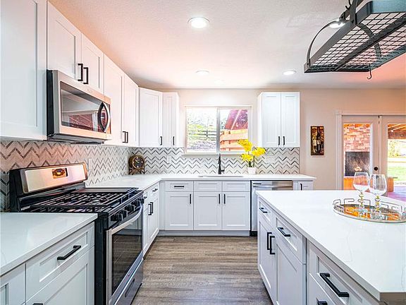 At entry, you have a large front room with a Big dining area for 8 person seating and the holidays. Next, There is a Cozy family TV room that can easily hold your large sectional . Next is the Newly Remodeled kitchen with high end granite, expanded 36 inch upper cabs and a VERY stylish backsplash. The 4 Stainless steel appliances are new and have manufactures warranty for your buyers!