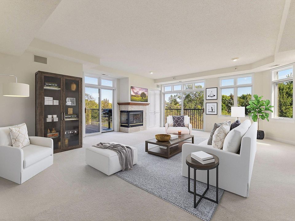 RARELY available 3rd floor, end unit! Extraordinary, sun filled, open spaces with walls of windows. Gorgeous tree top views - incredibly serene. Freshly painted and neutral decor throughout. Large inviting living room with a gas fireplace and mantel. Two sets of sliding doors for wonderful air flow and a private deck with a gas line for a grill. A spacious formal dining room, perfect for entertaining. A large kitchen with an abundance of white cabinetry, neutral countertops, Bosch, LG and GE appliances and an informal eating area overlooking the amazing foliage. Split bedroom set up for privacy. The primary bedroom has sliding doors to the deck, a bath with double sinks, bathtub, a separate walk-in shower and a 10 x 6 walk-in closet. The 2nd bedroom has a large walk-in closet and a 3/4 bath across the hall. High ceilings, wonderful charm/detail and hardwood floors. Spacious in unit laundry room and private storage room down the hall #317. 2 garage stalls #'s 19 & 64 with storage. Healthy Reserves! HOA maintains and replaces when needed the HVAC system. Enjoy the beautiful patio off the lobby w/ family and friends, a fully equipped community/party room and exercise room. Serene, private walking paths right out the door with pond views.