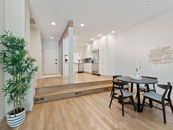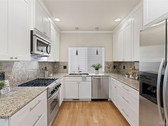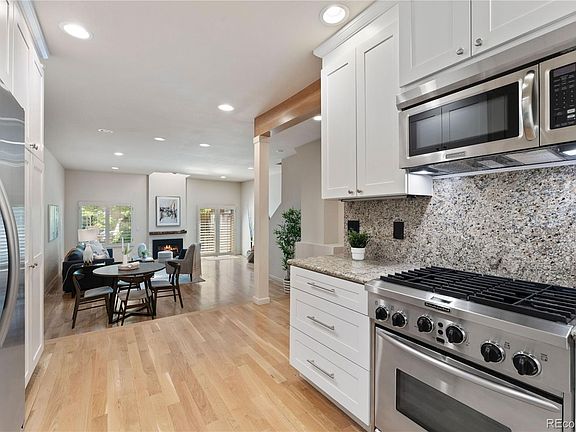 Showcasing stylish, contemporary design throughout, this spacious townhome offers low-maintenance living in a prime Centennial location. Step inside to find a grand open layout enhanced with gleaming hardwood floors, recessed lighting, charming planation shutters, and a crisp & clean color palette that’s great for any décor. Home chef will love the kitchen boasting ample white Shaker cabinetry, sleek granite countertops, and stainless steel appliances, including a chef-worthy KitchenAid gas-burner range. The dining room and living room flow seamlessly from the kitchen, making the space ideal for entertaining. A cozy gas-burning fireplace with stylish chunky wood mantel offers lovely ambiance and warmth all winter long. Open the door off the living room to the spacious private deck to easily extend your indoor/outdoor living space. Journey upstairs to find the home’s two spacious bedrooms with plush carpeting, including the primary with a private en-suite boasting an oversized walk-in shower. Newly finished basement features an expansive family room with the home’s 2nd fireplace and a nice built-in bar with convenient wine fridge and open shelving above the cabinets. Newer Furnace, A/C, and Smart thermostat! Ideally located within walking distance to Willow Springs Open Space, groceries and shops, and minutes to I-25 and C-470 to get you downtown or to the mountains in a jiffy. This townhome is a must-see gem that can’t be missed!