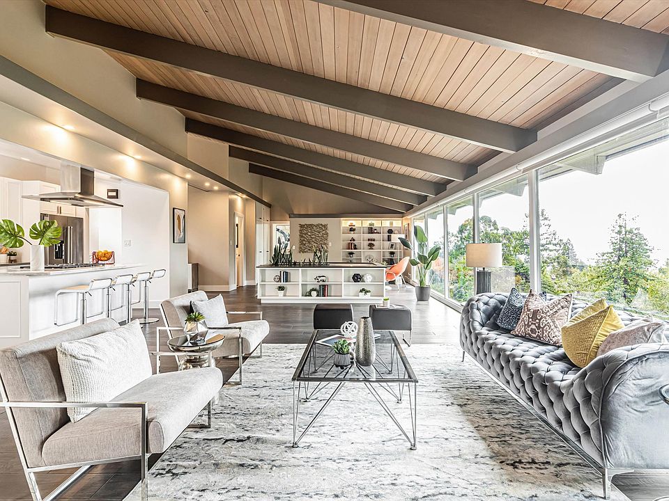 Carpe Diem! Welcome to 5555 La Salle Ave, a captivating two-story home nestled in the heart of Oakland's serene Montclair Village. This architectural masterpiece boasts high wood beam ceilings, infusing the space with an airy, open feel that is both timeless and inviting. This expansive 5 bed, 3 bath home offers a generous floor plan, perfect for both entertaining and everyday living. As you enter the gate, you’ll be greeted by an expansive patio garden lined by ornamental native bushes, citrus trees, and varietal maples. The garden also serves as an extra privacy buffer to the front door, which leads to a main living area bathed in natural light, thanks to floor-to-ceiling windows that showcase breathtaking views of Piedmont's lush greenery, downtown Oakland and the San Francisco Bay. The seamless of indoor and outdoor living allows you to enjoy the tranquil landscape alongside a backdrop of city views from every corner of the home. The upper level features spacious living and dining areas, a gourmet kitchen, a luxurious primary suite, and 2nd bedroom. The lower level offers a stunning wraparound balcony, additional bedrooms, laundry room, and flexible spaces that can be adapted to suit your needs, whether it’s a home office, gym, guest quarters, or workshop.
