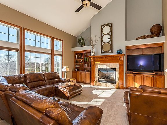 This spacious 1.5 story is located in a family-friendly neighborhood, on a quiet cul-de-sac, close to PV schools, Bett Rec Plex, I-80, medical offices and grocery stores. The main level has a soaring vaulted ceiling great room with lots of natural light exposure, an office/study, formal dining room, and features 2 fireplaces; one gas and one wood burning. Also located on the main floor is a half bath and large laundry/mudroom equipped with cabinets and storage. The kitchen features walnut hardwood floors, quartz counters, tiled backsplash, stainless steel appliances including double oven, gas stove and beverage refrigerator. Appliances stay with the home. The master bedroom is located on the main level and features carpet floors, tray ceiling and walk-in closet. The attached master bath includes travertine stone floors, quartz counters, jetted tub and stone shower. The upper level includes 3 bedrooms: 2 rooms share a Jack and Jill bath while the other has its own en suite bath. The partially finished walkout lower level features a full bath and ample storage area. There is also a framed in 5th bedroom and additional hobby room in the lower level. Outside you'll find nearly 1.5 acres, a new deck in March 2020 and a patio. The huge 3 stall garage measures 23'x 37' which can easily fit a full size truck and/or boat.
