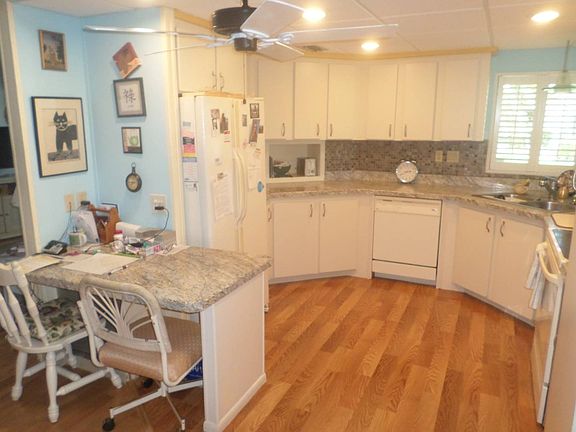 SELLER IS MOTIVATED - MAKE AN OFFER! Adorable turnkey getaway with vaulted ceilings, recently renovated kitchen, Florida room under air and 2013 A/C. Comfy indoor/outdoor enclosed porch off drive is a perfect place to enjoy the cooler months. Beautiful shady lot for relaxation all day long. Bring suitcase and start living your dream today!! This great home is located in the upscale gated 55+ community of Camelot Lakes where you'll have an endless supply of activities including swimming, shuffleboard, tennis, state-of-the-art fitness center, arts & crafts, luncheons, entertainment dinners, etc. Be as active as you want or kick back and relax! Grocery, home improvement, discount, pharmacy and great restaurants are just minutes away and only 7 miles to the #1 rated white sand beaches of Siesta Key! KITCHEN (11.4 x 11.5) Spacious kitchen was recently renovated including new granite look countertops, new cabinet door and drawer faces, new hardware and new laminate flooring. Floor to ceiling pantry has pull out drawer storage. Updated tile backsplash, pendant lighting over large double corner sink, plantation blinds. GE side-by-side refrigerator with ice maker, Kenmore smooth top range, Magic Chef built-in microwave and Whirlpool dishwasher. Two-seat breakfast bar. DINING AREA (9 X 11) Built-in china hutch, wood table with 4 matching chairs, lovely tiffany art deco light, laminate flooring. LIVING AREA (13.4 x 19.3) Open & airy living room with vaulted ceiling is fully furnished; two sofas, flat screen TV and entertainment cabinet, coffee table, end tables, sofa table, lamps, wall décor, area rug, plantation blinds and ceiling fan. FLORIDA ROOM (10 X 16.9) Inviting Florida room with just the right amount of sunlight! Furnished as shown including the beachy accents. Hardwood laminate flooring, plantation blinds and ceiling fan. MASTER BEDROOM (13.4 x 13.5) Spacious master with vaulted ceiling includes wall closet and walk-in closet in ensuite. Queen bed, two nightstands, matching dresser with mirror and hutch. Vertical blinds, ceiling fan, carpeting. Ensuite includes dressing area, plenty of counter space and vanity area, private walk-in shower/commode and ceramic tile flooring. The walk-in closet has custom built shelving on one side for shoes and extra storage. GUEST BEDROOM (10.5 x 13) Perfect size room for your guests. Full bed, 8 drawer dresser, computer desk & chair. Walk-in closet, vaulted ceiling, vertical blinds, carpeting. MAIN BATHROOM (6 x 9) Vaulted ceiling bathroom with beachy accents, updated mirror and lighting. Tub/shower combo and ceramic tile flooring. COVERED SCREENED PORCH & PATIO GARDEN - Recent ramp addition (not pictured) is easily removed. Private screened porch off front entry also houses the laundry/storage shed. Frigidaire stacked washer/dryer. Patio garden enclosed with lattice fencing. EXTERIOR - Frigidaire A/C 2013. Membrane roof over. Shady lot and nicely maintained landscaping. Monthly lot rent of $928 includes water, sewer, trash pickup, lawn maintenance, taxes and all park amenities.