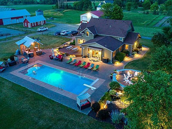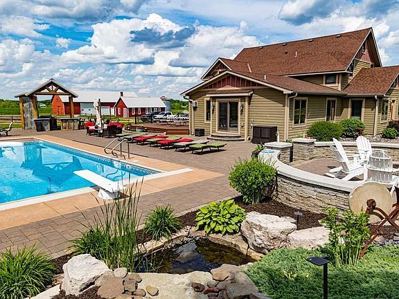 Luxurious country living! 20 acre setting features a 2013 professionally remodeled home (down to the studs) w/5 bedrooms, 5 baths, gourmet kitchen, Viking appliances, Subzero fridge, granite tops, center island and custom knotty alder cabinets. Open family room with fplc & wet bar. Hwd and tile flrs throughout. Main floor master suite includes private sitting area, his/hers closets & steam shower. Upper level complete with 4 bedrooms & 2 baths both with dual vanities. Finished lower level boasts amusement room, fieldstone foundation walls/archway and sauna. Paver outdoor entertainment area showcases outdoor wet bar, saltwater pool, low maintenance deck, pool bath, two firepits (1 gas, 1 wood), waterfall and extensive professional landscaping. Heated & insulated attached garage, 40x60 heated/cooled outbuilding with floor drain, 15'+ sidewalls & 14' doors, 62x36 historic barn, 78x30 machine shed, corn crib & 40x16 storage. Additional bldg entitlement. Your own private oasis awaits!