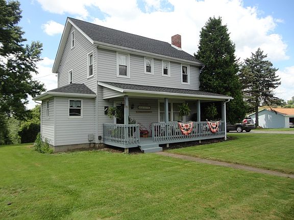 Welcome to the country! Here you have a beautiful and very well maintained 2 story home with a relaxing front covered porch along with a wonderful two tiered side deck. This home is surrounded by a beautiful flat yard with an above ground swimming pool and a paved driveway that leads to a 2 car detached garage. Inside you will find 3 bedrooms, 2 baths, an eat in kitchen with a stainless steel refrigerator, and a living room with a beautiful staircase and large window for plenty of natural light. Also for storage, you have a huge walk-up attic that can be easily converted to additional living space. Call and come see for yourself! Mineral rights are leased and will transfer. Some furnishings are negotiable.