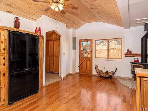 1.9 miles off Hwy 24 just west of Florissant sits a move in ready home with tons of custom wood accents throughout the main level, an unfinished basement to add some equity and a large workshop/garage that is over 500 SF and wired for electricity. The 3 acre parcel that this home sits on is zoned for horses and is slightly sloping and flat on much of the acreage and has an easily accessible driveway with year round easy access off of a well maintained county road. Two storage buildings, a good well and 1500 Gallon septic. The unfinished basement has a rough-in, a wood burning stove installed and is a walkout with french doors to the exterior and a beautiful spiral staircase from the main level. Tongue and groove pine ceilings in the kitchen, custom built cabinetry and lots of live edge trim and accents make this home truly one of a kind. Lay in bed and look out at the most spectacular view of pikes peak, views are expansive This home checks off your wish list in a hurry. Check it out