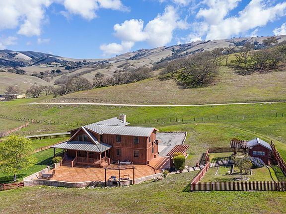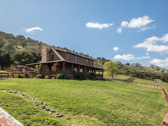 Situated perfectly in the Pastures of Heaven you will find this welcoming residence ideally located on 10+ gently sloping acres. The 2,714 square foot four bedroom home has an authentic western style including a wraparound porch where you will certainly end your day relaxing and enjoying the rolling hills and cooling coastal breezes. The house has beautiful hardwood floors throughout the lower level and open beamed ceilings and vaulted ceilings upstairs. The spacious master bedroom suite enjoys views in multiple directions and a warming fireplace. The kitchen is well appointed with top of the line appliances and an outdoor cooking area complete with a cowboy style wood barbeque and large entertaining patio. Below the residence you will find a full barn equipped with tack room, feed room and storage loft. Equestrian fans will also appreciate the large riding arena and 4 stall pipe corral. Welcome to Steinbeck Country, just sit back and enjoy.