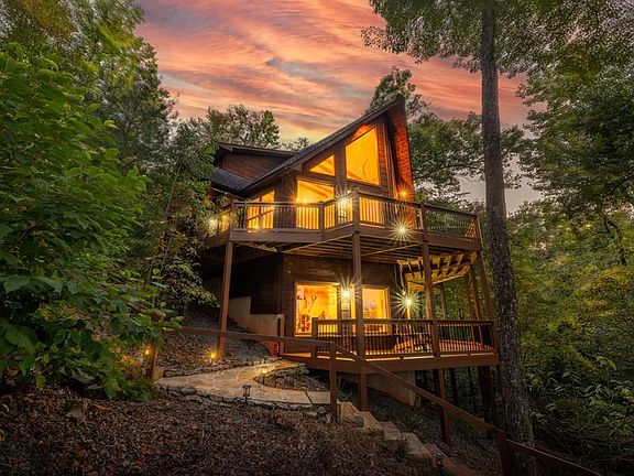 Like something straight out of a magazine, this custom-built home is full of character and warmth with long-range mountain views and Lake Blue Ridge. Built in 2017, this 3 bed 3 1/2 bath is conveniently located about 12 minutes from downtown Blue Ridge and part of the Aska Adventure area. The interior boasts high-end finishes like granite countertops, hammered copper sinks in the bathrooms, mountain laurel staircases, a travertine kitchen sink, and a mosaic kitchen floor. The floor plan has three finished levels with a cohesive design, with all bathrooms featuring matching finishes and one bedroom on each floor: the primary suite upstairs, a second primary on the main floor off the kitchen and the third on the fully finished lower level. The home offers three fireplaces, including two gas fireplaces inside and one wood-burning fireplace on the outside deck, plus a convenient laundry room on the lower level. The exterior features two recently stained decks and a stunning rock slab stairway down to the custom stacked stone firepit. The cabin has newly paved roadways all the way to the driveway and is situated in a private, peaceful setting. A beautiful and immaculately maintained cabin that is ready for its next owner to cherish its gorgeous views that the sellers will miss!!