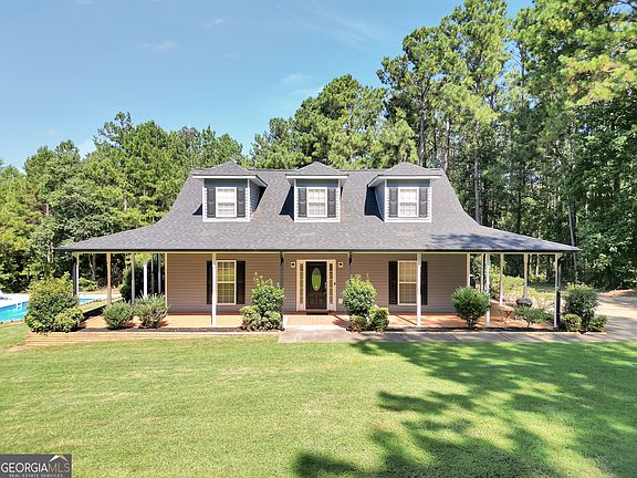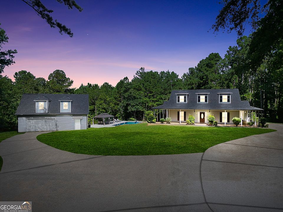 Welcome to this beautifully maintained 1.5 story, 3 bedroom, 2.5 bath home in the desirable Locust Grove school district. From the moment you arrive, the inviting wraparound porch sets the tone for Southern charm and relaxed living. Inside, the main-level owner's suite offers comfort and convenience, while the home's layout provides multiple living areas including a separate dining room, formal living room, great room, and sunroom. The spacious kitchen features tile floors, a breakfast bar, and breakfast area overlooking the living room and great room. Upstairs, two additional bedrooms and a full bath provide space for family or guests. Step outside to your very own private retreat complete with an inground saltwater pool, an additional outbuilding, and a detached 1,860 sq ft garage/workshop with upstairs space that could be finished into a 1-bedroom apartment, office, or studio. Whether you're looking for storage, hobby space, or income potential, this property delivers. Hardwood floors throughout, tile in kitchen and baths, plus recent updates including a newer roof and HVAC unit, make this home as functional as it is charming. Conveniently located near I-75, Tanger Outlets, shopping, and dining, this one offers the perfect blend of privacy, convenience, and possibility.