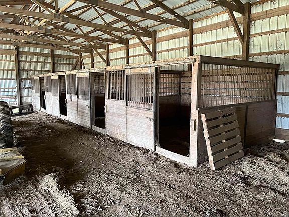 Don't miss this 3 bedroom, 2.5 bath house situated on nearly 30 acres. The main level includes kitchen, dining room, living room, bedroom with ensuite bathroom, laundry, and additional 1/2 bath. Upstairs, there are 2 bedrooms and another full bathroom. Recent updates include new roof, flooring, and double entry doors (2023). Outside--the long driveway splits the property nearly straight down the middle, with both sides separately and completely fenced. There is a nice mix of tillable land and woodland. Within the perimeter fencing, there are additional smaller fenced areas or "pens" set up for horses or livestock and multiple water hydrants. Additional buildings include a detached 2-car garage (24x30), two (12x24) metal "lean-to" structures, and a large 45x60 pole barn/stable with horse stalls and large sliding doors. Must see!