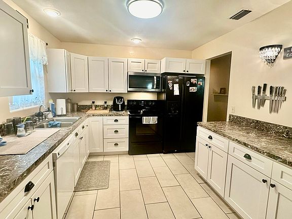 The kitchen has been remodeled with newer appliances, custom cabinets and tile flooring with loads of storage and counter space.
