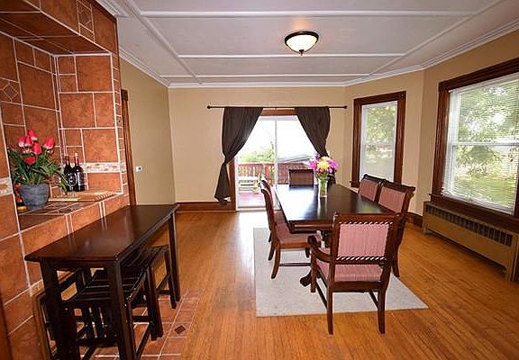 Well-cared-for Victorian home in convenient location. Spacious rooms with hardwood floors and lovely detail wood trim throughout. Pellet stove in living room included. The 3rd floor has three finished rooms, adding valuable extra space for use or storage. First floor features three 3-season porches. Full, dry basement. Roof, boiler and hot water heater all new within the past 5 years, replacement windows throughout the house. One car garage has nice work-space, a basement and second floor. The yard has a variety of plant life, including grapes, flowers, two apple trees, a deck, patio, fire pit, and nice lawn. Maintained park with modern playground directly across the street and Silver Lake is a 5 minute walk away (0.2 miles). Fantastic family home!