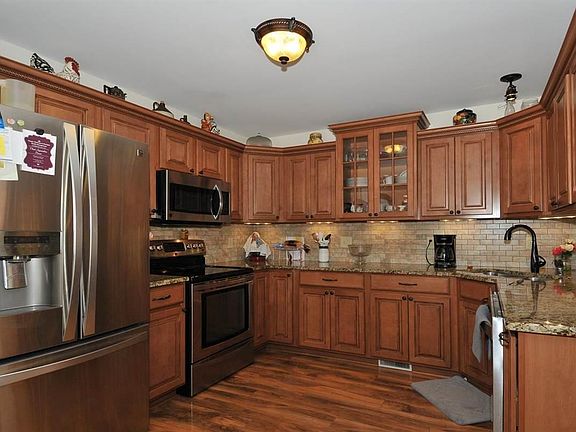 No need to vacation once you call this spacious 3 Bdrm, 2 Bath Ranch on 8 picture-perfect acres home! Dream kitchen with gorgeous floors, granite countertops, neutral tile backsplash, and upgraded cabinetry with soft close drawers. Dining area has french doors that lead to the back deck with a view of a park-like setting. Large master suite with jetted tub. Bsmt with walkout to acres and acres of land. Separate weight room area that would be great for storage, office, or playroom. The wall of windows allows an abundance of natural light and helps keep heating and cooling bills low.