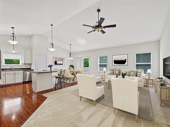 Looking for a beautiful one-story home? Make this stunning 4-bed 3-bath ranch home yours! Step inside the spacious open entryway onto gorgeous luxury laminate plank flooring.Fall in love w/ this floor plan, open and bright thru-out! Tastefully designed kitchen, feat. custom cabinets that provide ample storage space, center island, stainless steel appliances, vaulted ceilings that create an airy ambiance.Walk out from the dining area onto the maintenance free deck, perfect for entertaining guests. Very spacious master bedroom suite w/ coffered ceilings, walk-in closet, lux. master bath with double sinks and shower. You will love the Huge main floor laundry room w/ storage space.Venture downstairs to the finished walkout basement, where you'll find an additional bedroom, bathroom, and a generous recreational area.The beauty of nature surrounds this exceptional property as it backs to a serene wooded area. Enjoy the club pool and playground this community provides all summer long! Some Accessible Features