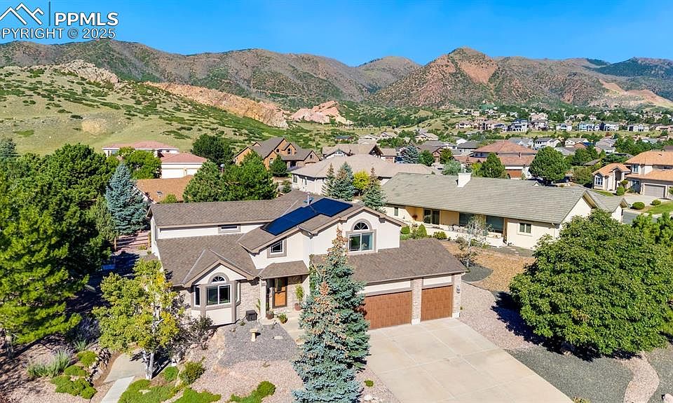 The One for Sophistication. Exquisitely remodeled with exceptional craftsmanship and enduring materials throughout, this Mountain Shadows home blends modern design with everyday livability. Genuine white oak hardwoods grace the main and upper levels, with matching engineered planks below—no carpet anywhere, ideal for allergy-sensitive living. The open, re-imagined layout begins with a dramatic two-story entry and living room showcasing metal-rail stair design, soaring ceilings, and a soapstone-surround fireplace framed by custom prairie-art tile and floating shelves. The spectacular kitchen—transformed through wall removal for maximum openness—features hickory cabinetry, a two-tier soapstone island, LG stainless gas range with ducted hood, floating shelves, and coordinated soapstone accents. The adjacent family room centers on a second fireplace and flows naturally to a xeriscaped backyard with raised garden beds, stone-framed gas fire feature, and minimal water use for effortless outdoor enjoyment. Upstairs, the vaulted primary suite offers sweeping views of Ute Valley Park and sparkling evening city lights; its remodeled bath highlights a freestanding clawfoot tub and frameless glass shower with custom tile. Three secondary bedrooms share a full bath, each with unique perspectives—city lights, rock formations, or the shoulder of Pikes Peak. A bright walk-out basement adds a granite wet bar, guest suite, and recreation space. Paid-off solar panels ensure impressively low utility costs, while the stucco exterior and finished three-car garage with 200-amp service and dual 220 V outlets enhance function and longevity. Situated on a quiet cul-de-sac, walking distance to Chipeta Elementary, and minutes from Garden of the Gods, Ute Valley Park, and the Air Force Academy, this home pairs refined updates with Colorado lifestyle efficiency. Where craftsmanship, comfort, and sustainability meet.