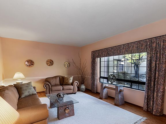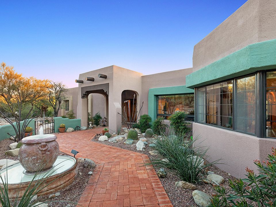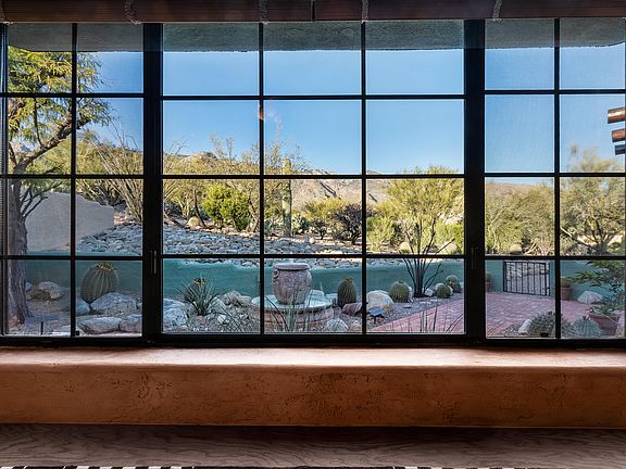 Sellers offering $15,000 credit at closing for buyer preferred upgrades to home. Located on 1.3 acres this home features courtyard entry with fountain.All windows have views; mountain in front, panoramic in back. Tall ceilings, arched hallways, oak wood floors, makes this custom home stand out. Master bdr has beehive fireplace, spacious bathroom, petrified wood sinks, jetted tub, separate shower, walk in closet, hall bath has glass bowl sink, 4th bdr has its own 3/4 bath. All baths have updated tile. Lighted low care landscape back and front. Sparkling pool/spa. Home has well insulated concrete block & stucco construction. High ceiling in garage with automatic security locking door & storage cabinets. Home has been impeccably cared for with most mechanical systems recently replaced.