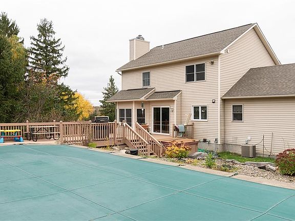 beautifully maintained home with the most amazing views for miles! This home is located on over 1.5 acres. The home offers a great floor plan. Large kitchen with granite countertops, large island and all appliances staying. The eat in kitchen flows into the cozy living room with a wood burning stove (fireplace). Great office or 2nd living room with hardwoods floors and French doors. Formal dining room, first floor laundry and Half bath complete the first level. On the second floor you will find a master suite with walk in closet, and master bath. 3 additional bedrooms all with ample closet space. Hardwoods found throughout this home . The brand new finished basement just add more living space. Wonderful pool pool shed and large deck complete this oasis. Many areas for a garden. Lots of fruit trees planted out front for your enjoyment . All newer mechanics and roof come take a look and enjoy .