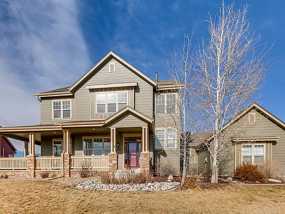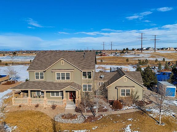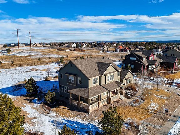 This stunning 4 bedroom/4 bathroom home is located on a south facing .92 are lot in Castlewood Ranch Estates. It has easy access to the Denver Metro Area. You enter the home via a large wrap-around front porch. The open floor plan is flooded with natural light from windows providing a view of Castlewood Canyon. A formal dining room on the left leads into a wet bar and then into the kitchen. The huge kitchen has granite counter tops, a gas stove, and an adjoining sitting area that has a double-sided stone fireplace which is perfect for entertaining guests. The living room is bright and roomy. Hardwood flooring covers most of the main level. A private study off the living room can be used as a guest bedroom if desired. The second story loft provides access to a master bedroom with a large, luxurious en-suite bathroom, a separate bedroom with bath room, and 2 bedrooms share a Jack and Jill bathroom. The professional landscaped yard provides privacy and maintains uniqueness.