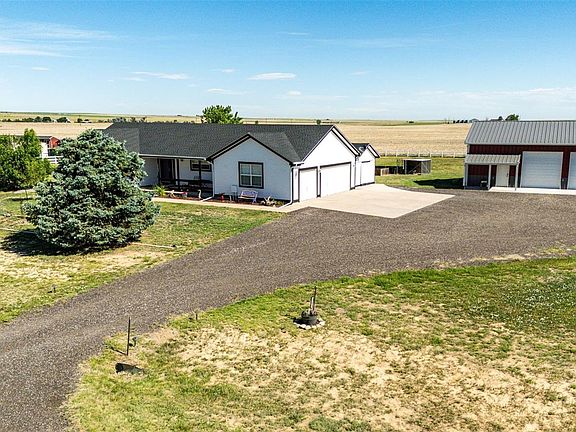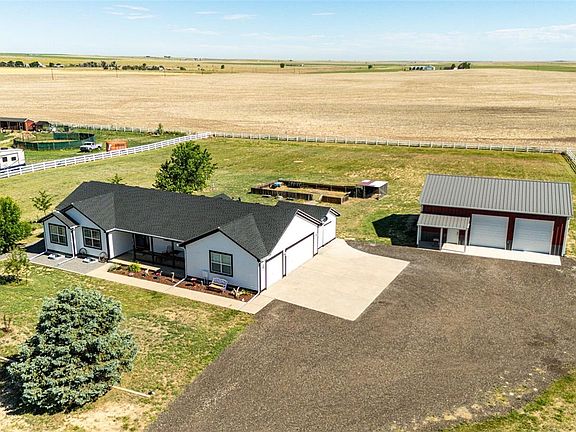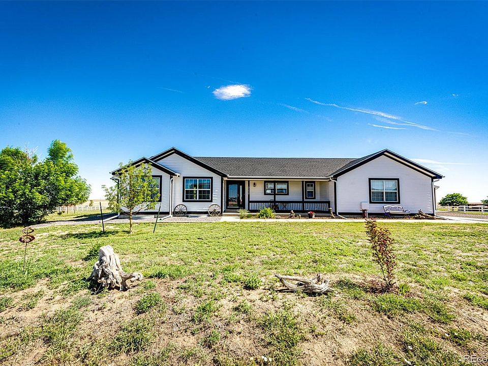 Embrace the essence of country living in this charming, open-concept 3 bedroom, 2 1/2 bath home with a 3 car garage on 2.5 acres in Strasburg's highly sought-after Wolf Creek Farms neighborhood. The home interior boasts an updated kitchen featuring plenty of cabinet and countertop space and updated Hickory wood floors. You can customize the unfinished basement to your liking. The home's exterior was painted on 6/24, and a new roof and gutters were completed in 2023. The house sits on a quiet street backing open farm ground to the Northwest. Enjoy the 32x40 outbuilding with a covered porch area, 12 ft ceilings, and 10 ft doors. GREAT LOCATION, only 30 minutes to Denver, Brighton, and DIA.