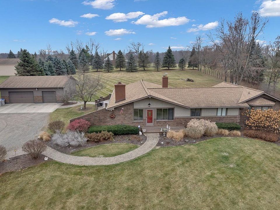 Welcoming ranch on acreage in peaceful rural setting, yet close to expressways, shopping, restaurants. Open concept great room with vaulted ceiling and kitchen with wood floors and two islands! Relax in luxury in your spacious primary en suite with gas fireplace, vaulted ceilings, and door wall to private patio deck. Finished basement with wood burning stove and third full bath. And the garage!... Heated 3 car garage with workshop area, hoist, air compressor and overhead storage. Kitchen/Great Room and Primary En Suite Addition completed in 2001. Also, New Furnace (2022), A/C (2021), New water filter system (2021) , Roof (2016).