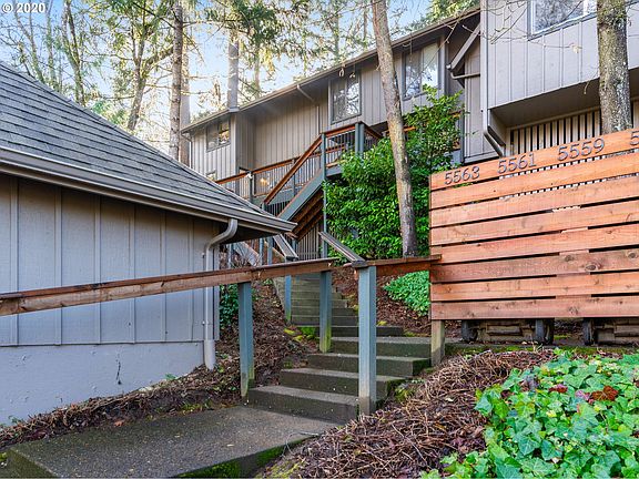 Wonderful end-unit townhome in tranquil setting amongst the trees. Beautifully updated with new flooring throughout. Main level features fully furnished kitchen open to living area. Eating bar and dining area combine with cozy living room, fireplace. Slider to private patio in back. Upstairs master includes view overlooking the treetops. Single, detached garage included. Great, close-in, Maplewood Neighborhood location. Nearby Gabriel Park with dog park, sports fields, playground. [Home Energy Score = 6. HES Report at https://rpt.greenbuildingregistry.com/hes/OR10097163]