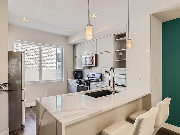 Sleek and modern finishes surface throughout this West Line Village residence. Situated within an innovative community just a few blocks from Sloan's Lake. A convenient home office/flex room completes the main level. Upstairs you enter into an open floor plan beaming w/ custom selections and stylish details throughout. A center island with a waterfall countertop feature poised beneath pendant lighting grounds a kitchen complete w/ abundant cabinetry and stainless steel appliances. Illuminated by a contemporary light fixture, a dining area offers the perfect space for enjoying late-morning brunch. Modern electric fireplace upgrade in the living room allowing a cozy evening in. Nest thermostat and doorbell for convenience and safety. Sliding glass doors in the living area open to reveal access to a coveted outdoor balcony. Upstairs, two sizable bedrooms w/ en-suite baths and large walk-in closets. A one car garage with MyQ technology allowing you to get Amazon shipments while not at home. Residents enjoy an ideal location w/ easy access to Sloan's Lake, Edgewater, Union Station, Auraria and Lakewood Gulch Trail. *This is a 2 bedroom + flex room/office on main floor Renter is responsible for all utilities.