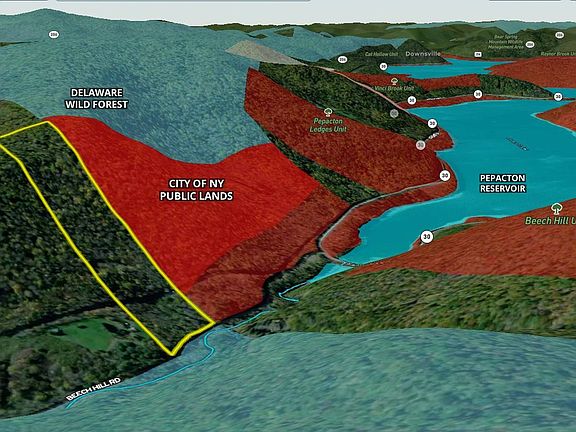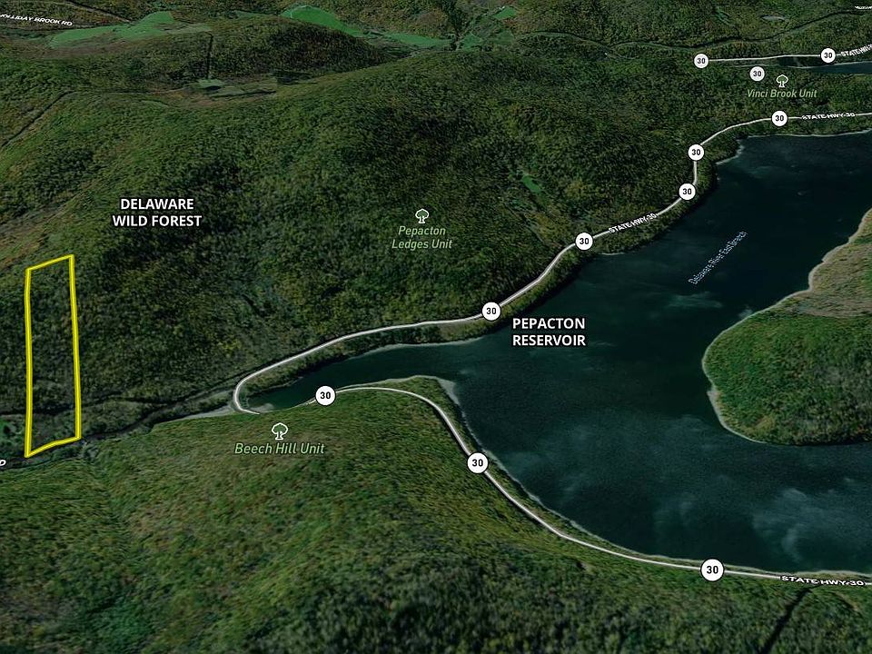 Don't miss when opportunity knocks: your new home, hunting/fishing base camp or vacation getaway awaits you less than 1/2 mile from Pepacton Reservoir. Electric and well (details unknown) are already present on the property, along with a gated driveway leading you up a moderate grade to a cleared fairly level area, with a small pond, that would make an ideal building spot. There are wild apple trees along with a mixed woods and rock outcroppings, as the grade increases towards the top of this property, typical of the rugged natural beauty typical of Delaware County. Access to additional hunting, hiking, and a multitude of other outdoor recreational activities are available as the entire western border of the property is bordered by NYC public lands, followed by the Delaware Wild Forest behind that and directly across the road from this property, providing thousands of acres of protected forest and wildlife at your borders. Only a short walk or drive to the Pepacton Reservoir, with its 5743 acres of pristine water, offers multiple public boat launches (no motors) where trophy sized brown trout and small mouth bass have been taken annually, while world renowned trout fishing is only 18 miles away in Roscoe. There is a 1950's single wide trailer on the property that is in rough condition. Amenities are available close by in either Downsville, 12 miles, or Margaretville only 14 miles. All these features, surrounded by natural beauty, located down a lovely country road and just over 2 hours from NYC, this could be a perfect location for a home, hunting/fishing or family vacation getaway