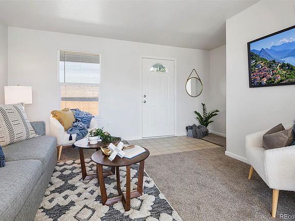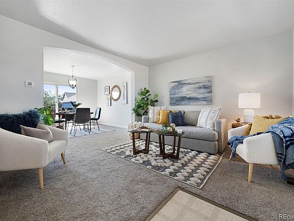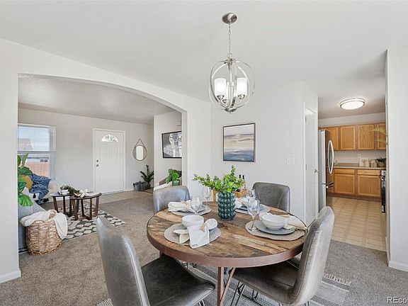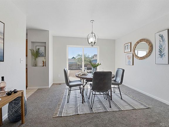 Welcome to this cozy two story home in the quintessential neighborhood of Wolf Creek Run in Strasburg. This charming home features fresh new updates and is ready to welcome you in. The most recent updates include new stainless steel appliances in the kitchen, new neutral interior paint and fresh new carpet with plush pad. The family room has open sight lines to the front and backyards, loads of natural light, and is comfortable for living and entertaining. The main floor has a spacious dining area, family room, kitchen, bedroom and 3/4 bathroom. Upstairs, the owners bedroom has a walk in closet. There are two other bedrooms, a laundry room, and a full bathroom with dual vanity also upstairs. There are two parking spaces directly behind in the home and a fully fenced backyard. Living here you'll enjoy quick access to the sprawling neighborhood park, playground and pool during the summertime. This home is conveniently located 30 minutes from DIA and 45 minutes to Downtown Denver or DTC.