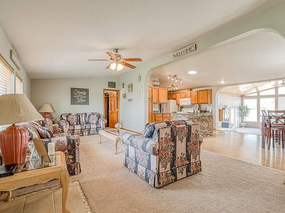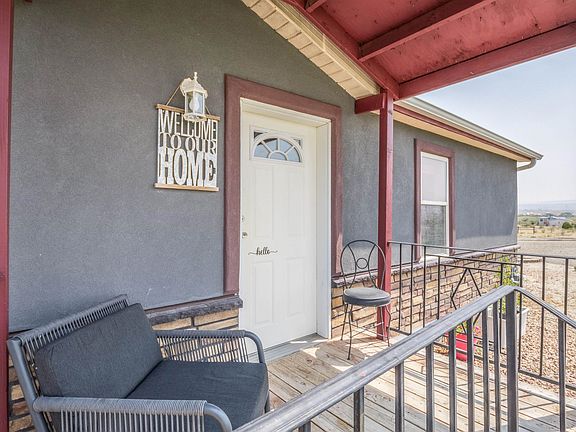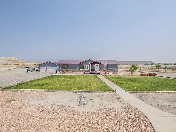 This charming home sits on 5 acres and features a large 40x60 pole barn, a 32x32 three-car garage/shop, a round pen, and a chicken coop. The property backs up to over 48,000 acres of BLM public land, offering endless opportunities for outdoor activities. This well-cared-for home boasts many recent updates that you'll love. The main living area is open and ideal for entertaining, while the spacious family room features vaulted ceilings and stunning views of the Grand Mesa. The split floor plan provides a private master suite with a walk-in closet and a luxurious five-piece bath, including a soaker tub and a walk-in shower. Enjoy the outdoor scenery from the lovely deck. All outbuildings are equipped with power, and there are two frost-free spigots. Irrigation water is available at the property line and ready for your use.
