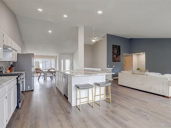 Open, spacious loft-like, gorgeous modern living - come see this updated ranch, full basement w/egress windows in welcoming Arrowhead. Enter into soaring and airy great space consisting of living room w/fireplace, dining, entry sitting area and a gorgeous kitchen with new SS appliances, expansive granite island, abundance of cabinets. You will love this kitchen! Beautiful new 9"x72" 40mil luxury waterproof flooring throughout entire main floor. Primary Bedroom has ensuite 5 piece bath, spacious, separated nicely from secondary bdrms. Secondary bedrooms have full bath & just off great room is the perfect powder bath for guests. Updated laundry room with hanging, folding, storage areas. Insulated 2 car garage. Enjoy entertaining on large deck. Rear yard has lots of opportunities to use your way-large dining & seating area, fire pit, children's play area etc. Increase yard by enclosing a portion of side yard. Shed included. Front sprinklers. Basement is unfinished except one heated, cooled, carpeted bonus room w/closet - perfect spot for a cozy den, nonconforming bedroom, playroom, craft room or office. Finish the basement for extended living area - it already has EGRESS WINDOWS and STUB OUTS (plumbing for bathroom). This home is newly updated with handsome flooring, expansive island, countertops, appliances, sinks/faucets, toilets, lighting, door hardware, paint. Home exterior newly painted and reroofed Dec 2020. Entirely replumbed with PEX and has a Halo Water Filtration system - Major value added. View the owner binder in the living room. Very low HOA, approx $29 monthly. All furniture is negotiable. The wonderful Arrowhead community is conveniently located 20 minutes to Downtown and 15 min to Boulder. Come see the vaulted ceilings, open floorplan, updates/upgrades. Showings begin Sat at 8am. So much new - this is the home you will want to call your own!