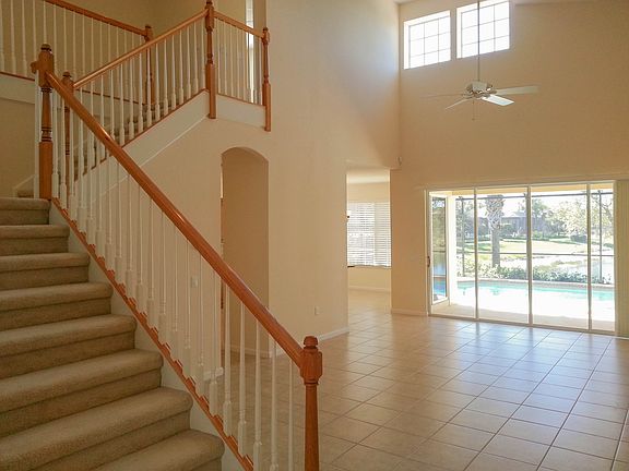 Absolutely Breathtaking and Private Long Lake View!!! This 4 bed 3 1/2 bath home is move in ready with the beautiful granite counters, upgraded tall kitchen cabinets, stainless steel appliances, plush carpeting and large tiled flooring. This magnificent view and large pool in a screened lanai captures you from the moment you walk through the front door. The pool looks as though it is sitting on the lake! Very large laundry room with a stationary tub and a large storage area which runs under the stairs. Make sure you watch the virtual tour! Close to shopping & restaurants.