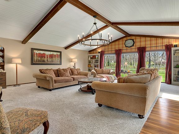 Welcome home! This completely updated ranch home is perfectly situated on 1.15 wooded acre lot with a charming split rail fence on a cul-de-sac. The combination of modern updates and natural charm creates a welcoming atmosphere. Enter into the generous foyer that has floor to ceiling windows to view the front and back yard and wood laminate flooring that flows into the large eat in kitchen! The updated kitchen boasts of beautiful cabinets, granite countertops, stainless steel appliances, feature brick wall with built in grill, and center island. Off the kitchen is an updated 1/2 bath and a large mudroom with access to the 2 car garage. The kitchen also opens up to the stunning great room with a gorgeous vaulted ceiling and wood beams. The floor to ceiling windows entice you to sit back and enjoy the outdoor views. The warm and inviting full brick wall fireplace is another great architectural feature that brings so much character and charm to this stunning room! The main level primary bedroom truly feels like a retreat with its slider to the deck and backyard, perfect for enjoying a morning coffee or evening breeze. The primary updated bathroom offers walk in closet, beautiful tiled shower, separate bathtub, double sink vanity and tiled floor. The partially exposed lower level offers a library that opens to the large family room flooded with natural light and perfect for entertaining! The two bedrooms both are light and bright and have close access to the full bathroom. There is an additional room that would make a perfect office, workout area, or playroom! The options endless! The large deck offers additional space for entertaining on those warm summer nights!