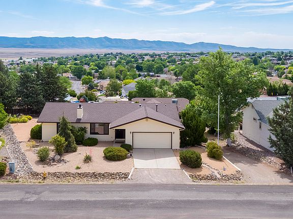 Nestled atop a beautiful spot looking out to Granite Mt and Glassford Hill with a peek of the Dells. This lovely home has front VIEWS and also back deck VIEWS of Mingus Mt. Wonderful layout with main-level living. 1st floor boasts eat-in-kitchen, open living/dining room with bamboo wood floor, master suite with updated bathroom and jetted tub. Opposite wing has an updated bathroom and 2 guest bedrooms. Lower level is finished with family room, pool room with pool-table included, wetbar, and 3/4 bath. Additional 139 sq ft craft/shop space plus a huge storage area. 2-car garage on main with 1-car garage on lower level. Outside includes a huge deck and peaceful walled courtyard where butterflies visit. Side yard has large RV/trailer parking area. NO HOA! This home has many inviting spaces!