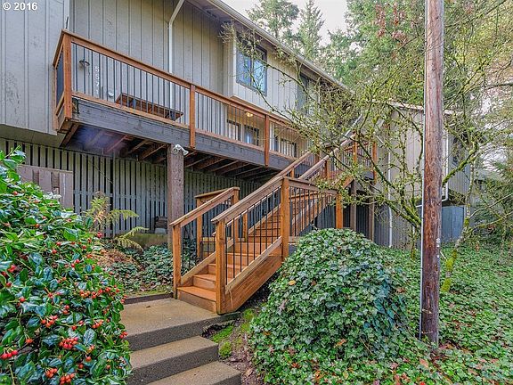 Townhome in private Hidden Village. Open floor plan on main, cozy stone fireplace in living rm w/slider to back deck. Great kitchen w/granite tile counters. 2 spacious bedrooms upstairs, updated baths, new: flooring upstairs, ductless heat pump, hot water heater, & garage door. Relaxing setting/prime location.Single detached garage with one extra spot. PRIME LOCATION! Mins to I-5, Hwy 99 & walk to Multnomah Vlg.